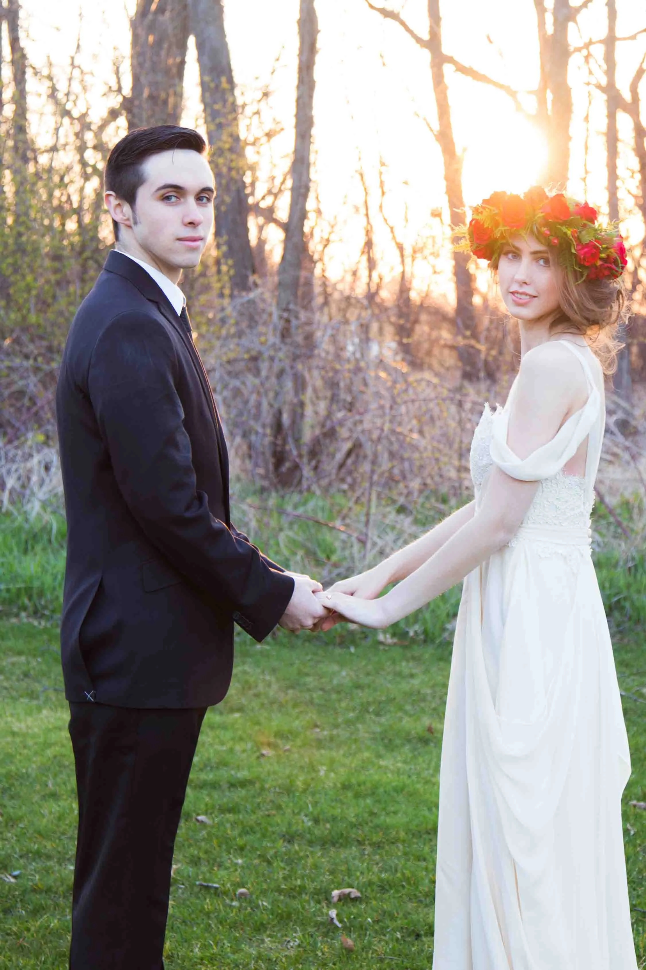Paradise Park in Cottage Grove truly is like Paradise. With it’s beautiful pond, gazebo, bridge, and the landscape (which I hear is even more pretty in the warmer months.) It’s a photographers dream. So, it’s no wonder why I chose this location for this styled wedding photo shoot. To go along with the beautiful location… beautiful people! Model Justine Marie Nitzke and her Boyfriend Brett did an awesome job (clearly, I mean just look at the pictures.) This photo shoot wouldn’t be complete, though, without the help of a few others. Stylist Lauren Michaela enhanced Justine’s beauty perfectly with this the curled side up-do and brown smokey eye. The Rose Cottage really outdid themselves with this stunning fresh flower head wreath. And last but not least, Moni of Monirose Bespoken Bridal Gowns. This romantic, flowing, soft pink crinkle chiffon gown was perfect for the photo shoot. The detail in her gowns is exquisite. I think I need to have a vow-renewal ceremony just so I can wear one of her gowns.