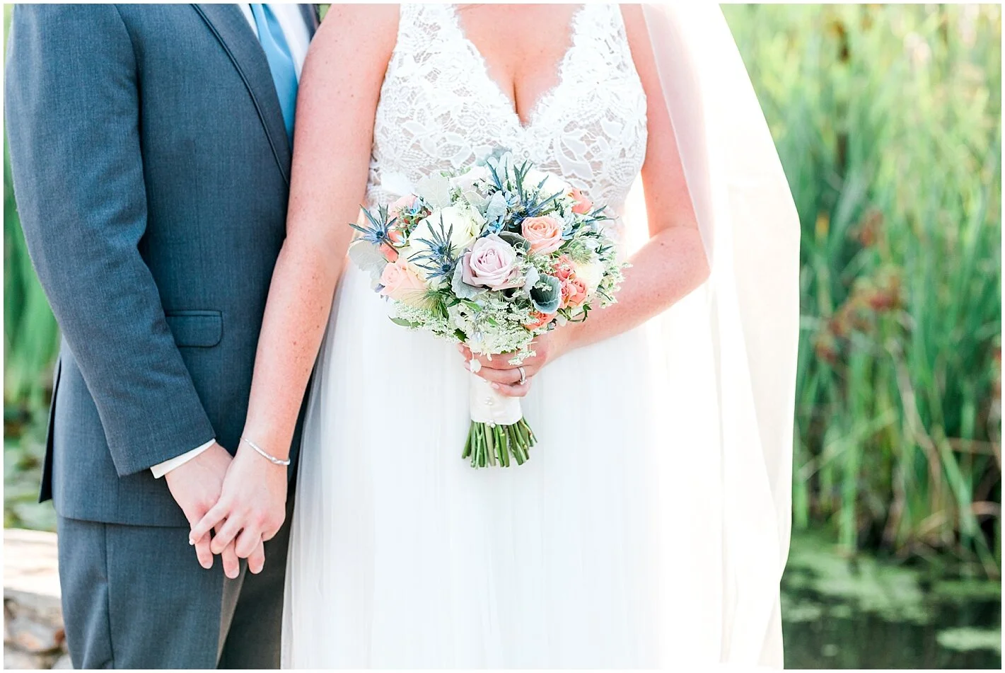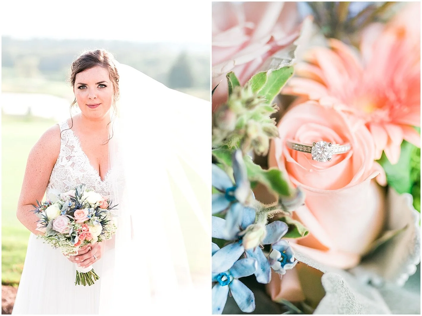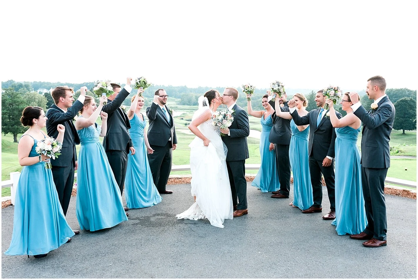 The reception at Merrimack Valley Golf Club was stunning!! The view of the golf course with the mountains in the back was so gorgeous! That is actually what Eric and Katie fell in love with when choosing this venue. The blue and grey wedding party attire was the perfect color to pop out against this background – it looked SO amazing, as you’ll see. I have never seen a wedding gown like Katie’s. The lace top with a peek-a-boo back and tulle skirt. And her cathedral veil!! SO STUNNING! I think most photographers get excited when we see a veil like Katie’s. Inside the reception hall was beautiful cathedral ceilings and large windows letting in lots of light! My favorite! The tables were decorated with gorgeous blue, peach and white flowers for the centerpieces and cute little boxes the read “let love glow” which had light up ice cubes in them. Such a fun and cute idea! I was very impressed with how the invitation suite, the signs, favor boxes, and everything matched with the same beautiful blue water color design! One of my favorite personal touches was their cake topper; a house with balloons and it said “you’re my greatest adventure” “Up” is one of my favorite movies of all time, so I loved this cake topper so much!! And Eric and Katie are a lot like Ellie and Carl. They are sweet, soft spoken, easy going, and love an adventure! AND Katie LOVES to scrapbook!